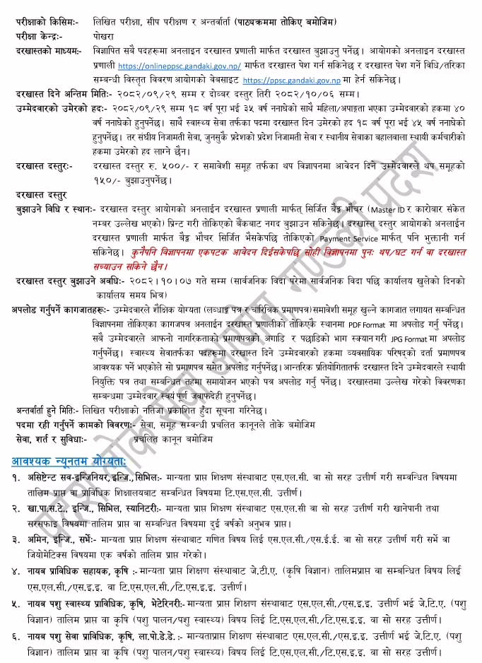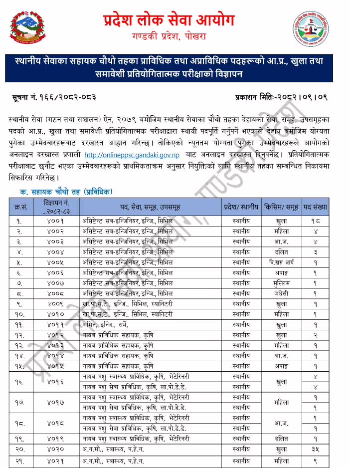 Province Public Service Commission, Gandaki Province, Pokhara Advertisement invites application from eligible candidates for Local Service 4th Level Assistant ( Non-Technical and Technical) positions to fill vacant positions.These vacant positions are to be fulfilled through internal, open and inclusive competitive examination.